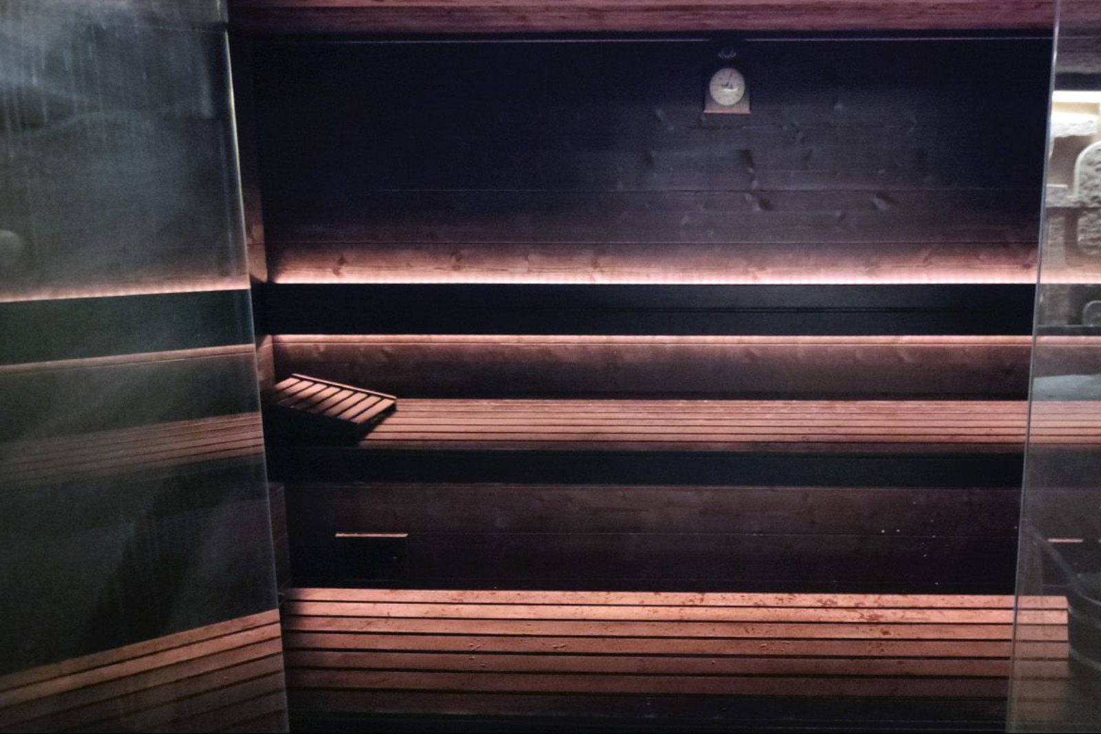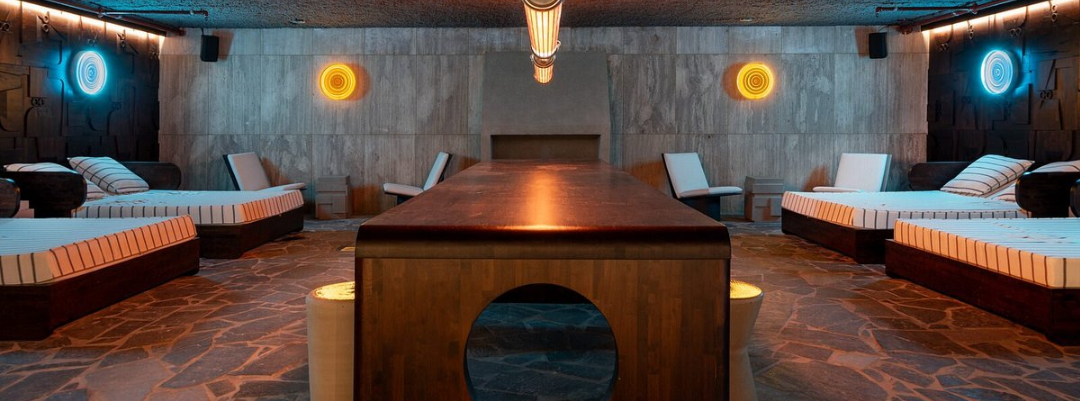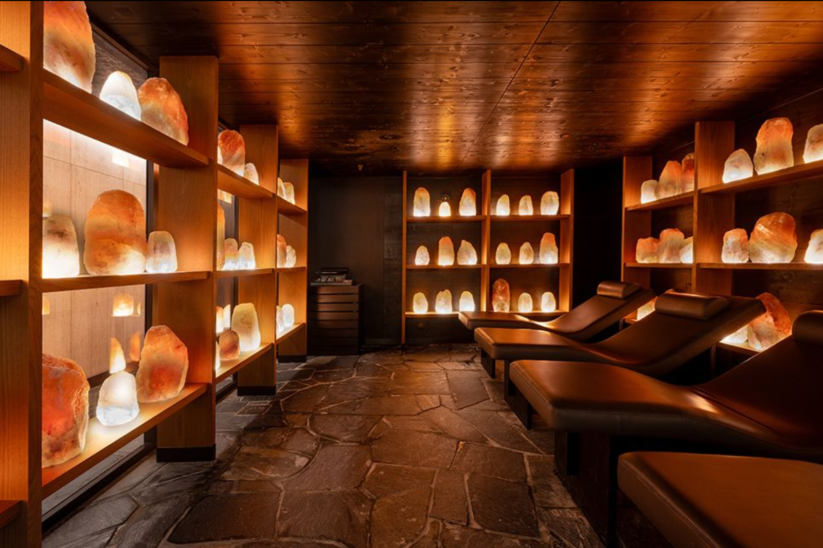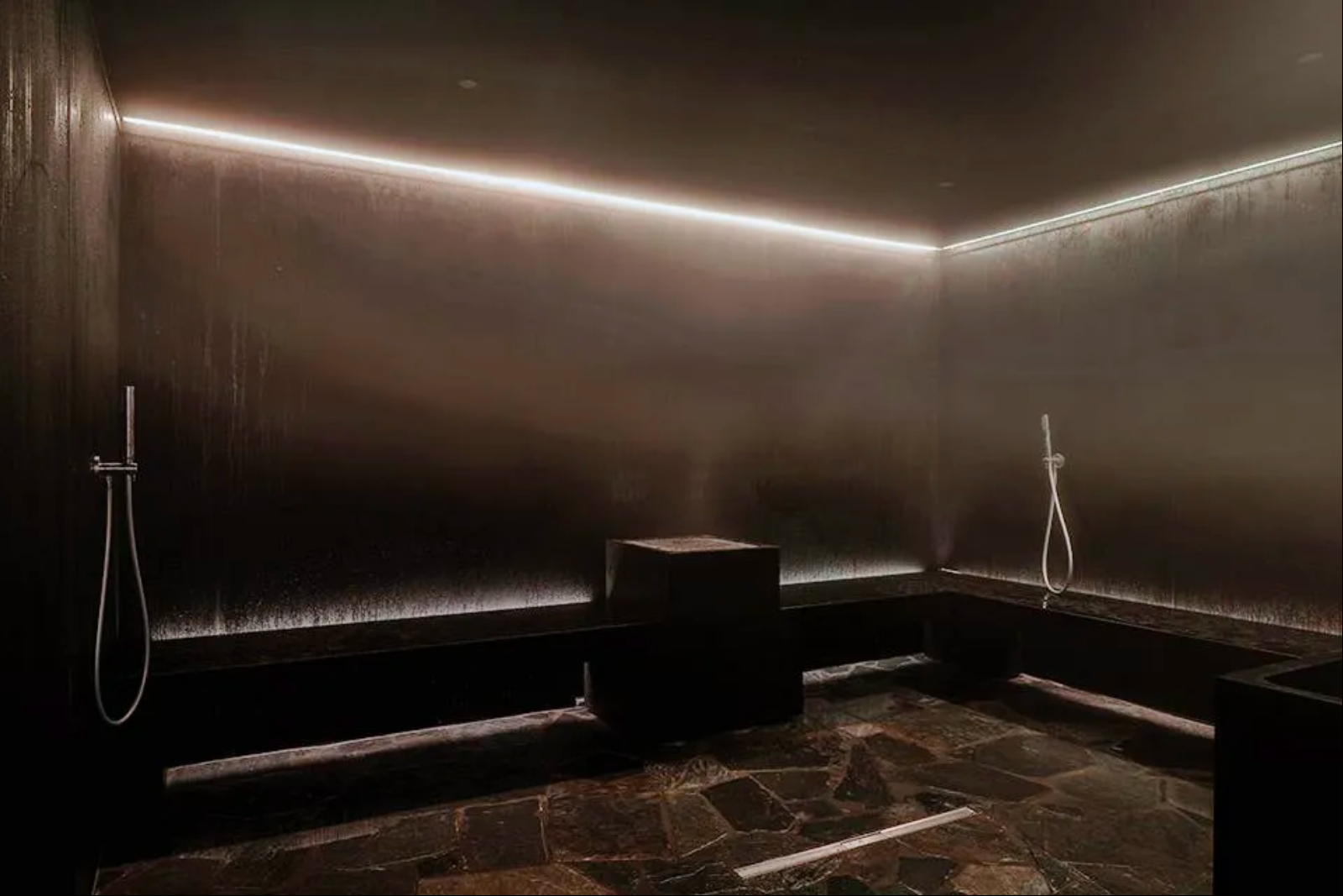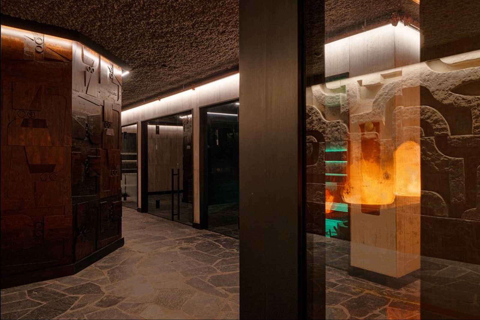 The spa features a variety of treatments, creating multisensory experiences and alternating hot and cold pathways. Two types of steam baths were designed — salt and aromatic hammams — along with three different saunas: a Finnish sauna, a bio-sauna, and a banja. For the cold therapy, a specially designed frigidarium is included.