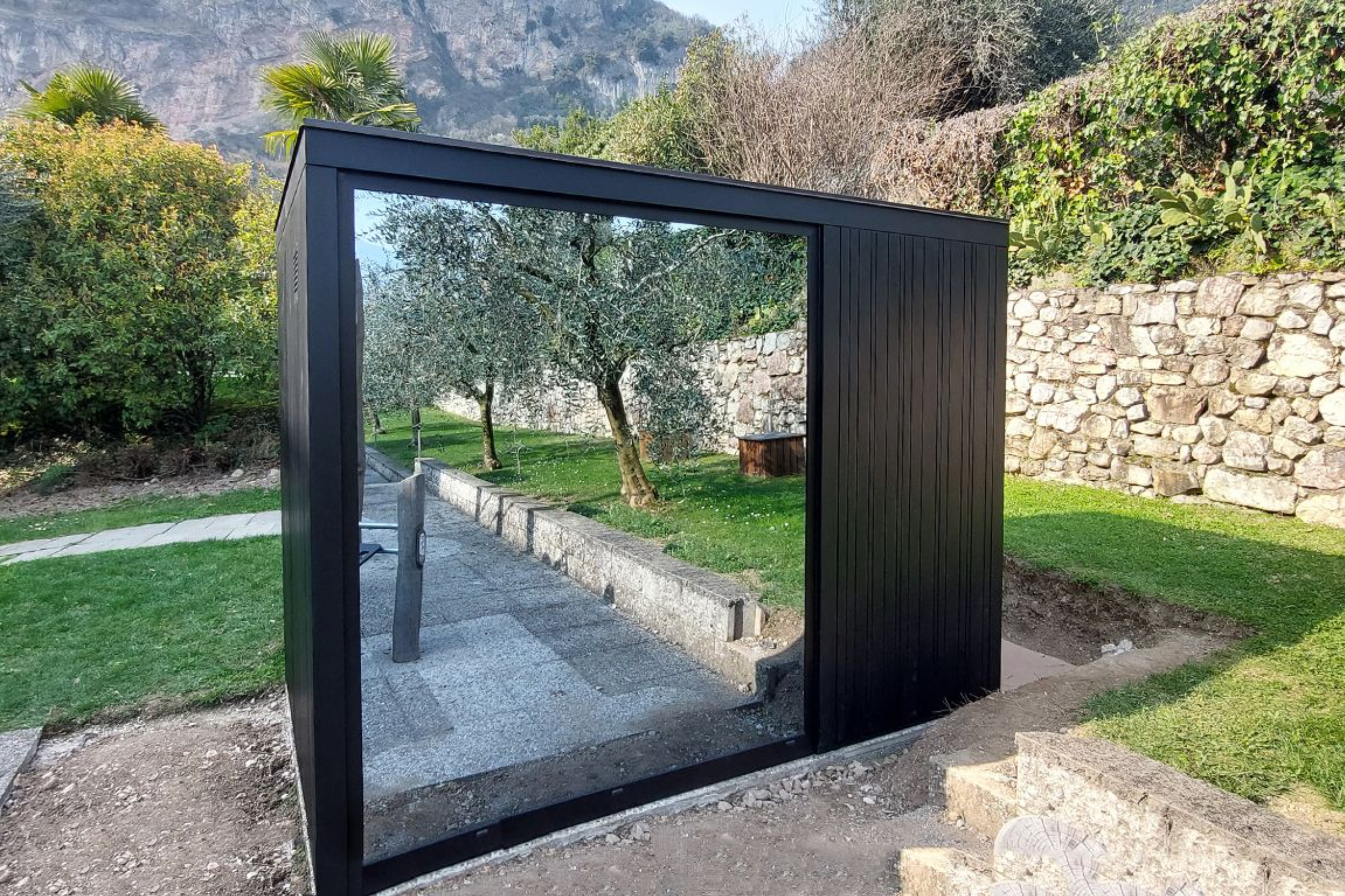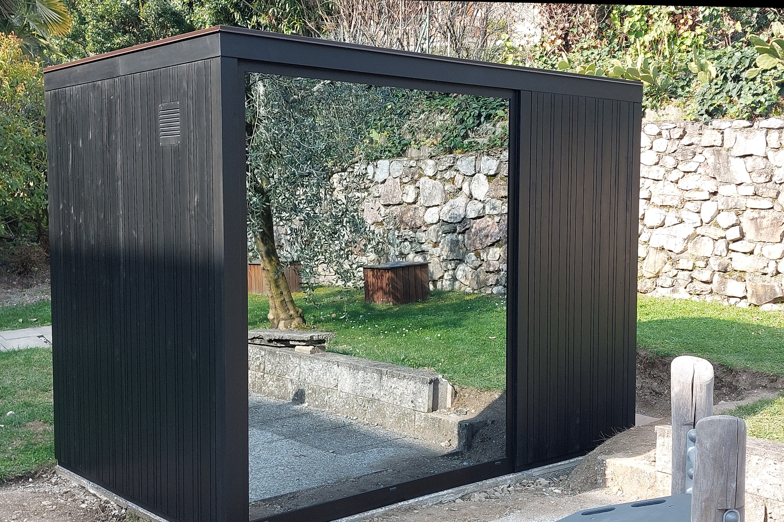 Le finiture delle pareti sono le medesime sia per l’interno che per l’esterno è in Abete black con pannelli con texture di linee verticali. Mentre le panche, il copristufa e tutti gli altri particolari interni sono realizzati in Thermowood, uno speciale legno termocotto per l’utilizzo in ambienti come la sauna. La particolarità di questa cabina outdoor è il vetro panoramico a specchio, che permette agli ospiti della sauna di vedere esternamente, ma non viceversa.