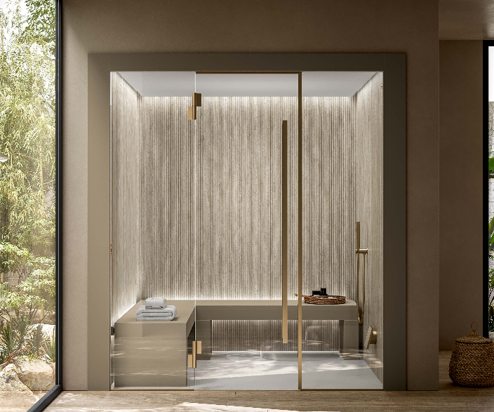 Ogni cabina integra un sistema di cromoterapia LED RGB o luce calda 2700K, doccino Kneipp, sensore di temperatura, e cerniere oleodinamiche soft-close per una chiusura fluida e silenziosa della porta.