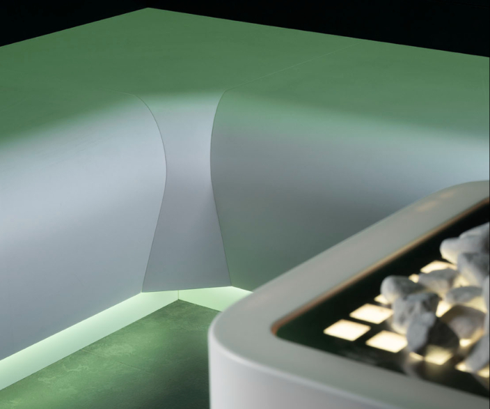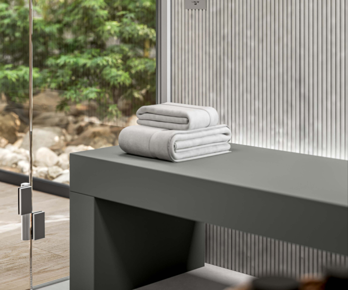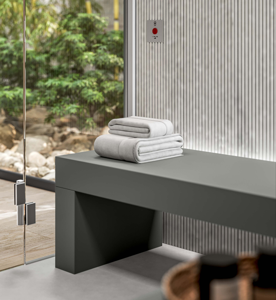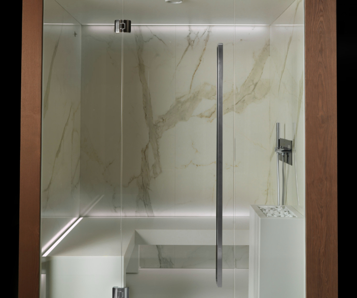 Le pareti in HPL o gres porcellanato effetto marmo, la panca curva in Solid Surface e le illuminazioni LED RGB o luce calda definiscono uno spazio raffinato, capace di coniugare benessere e stile.