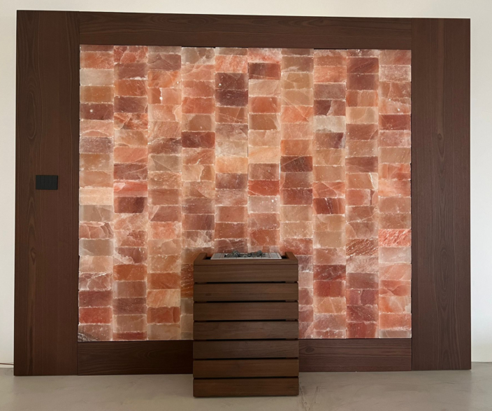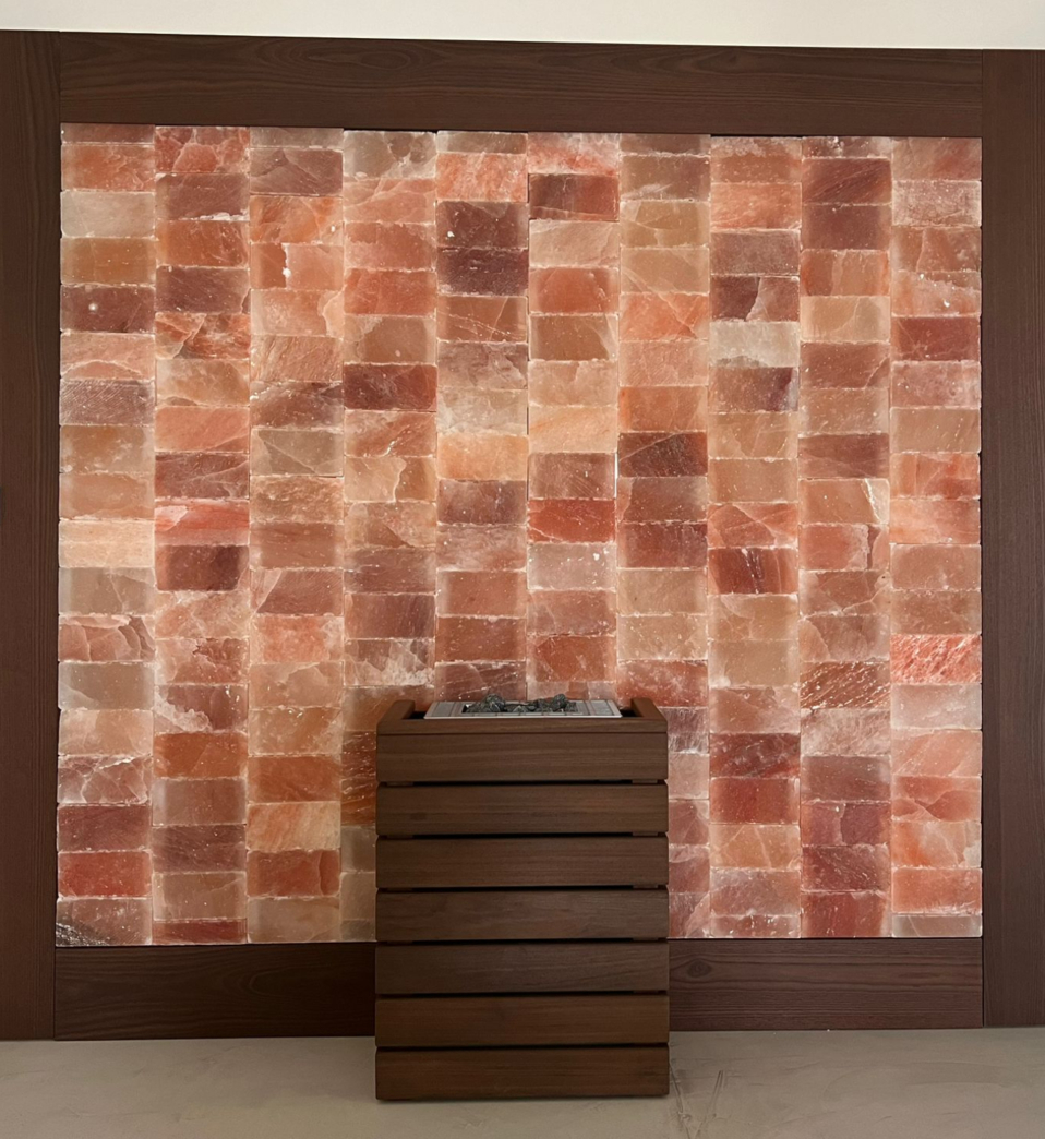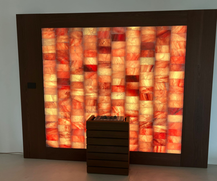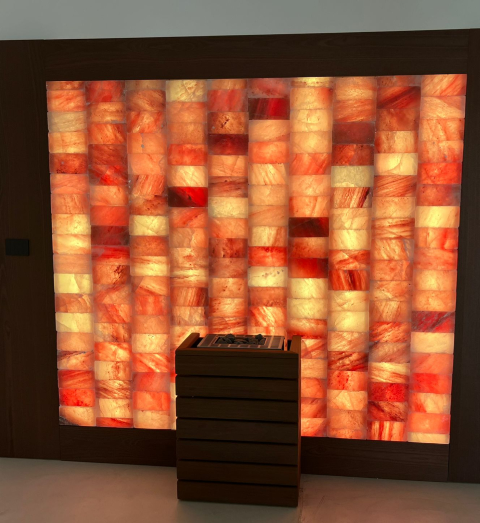 Il nostro Muro di Sale Himalayano è realizzato con autentici blocchi di sale rosa, selezionati per purezza e resa luminosa. Ogni elemento viene retroilluminato a LED per creare un’atmosfera calda e uniforme. La struttura è completata da una cornice in legno Thermowood, scelta per la sua stabilità, resistenza all’umidità e resa estetica naturale, garantendo un risultato elegante, duraturo e perfettamente integrato in ogni ambiente wellness professionale.