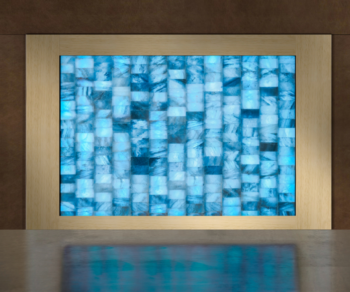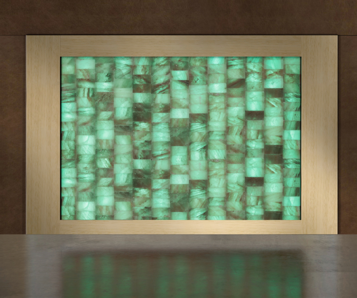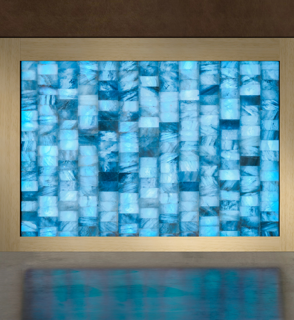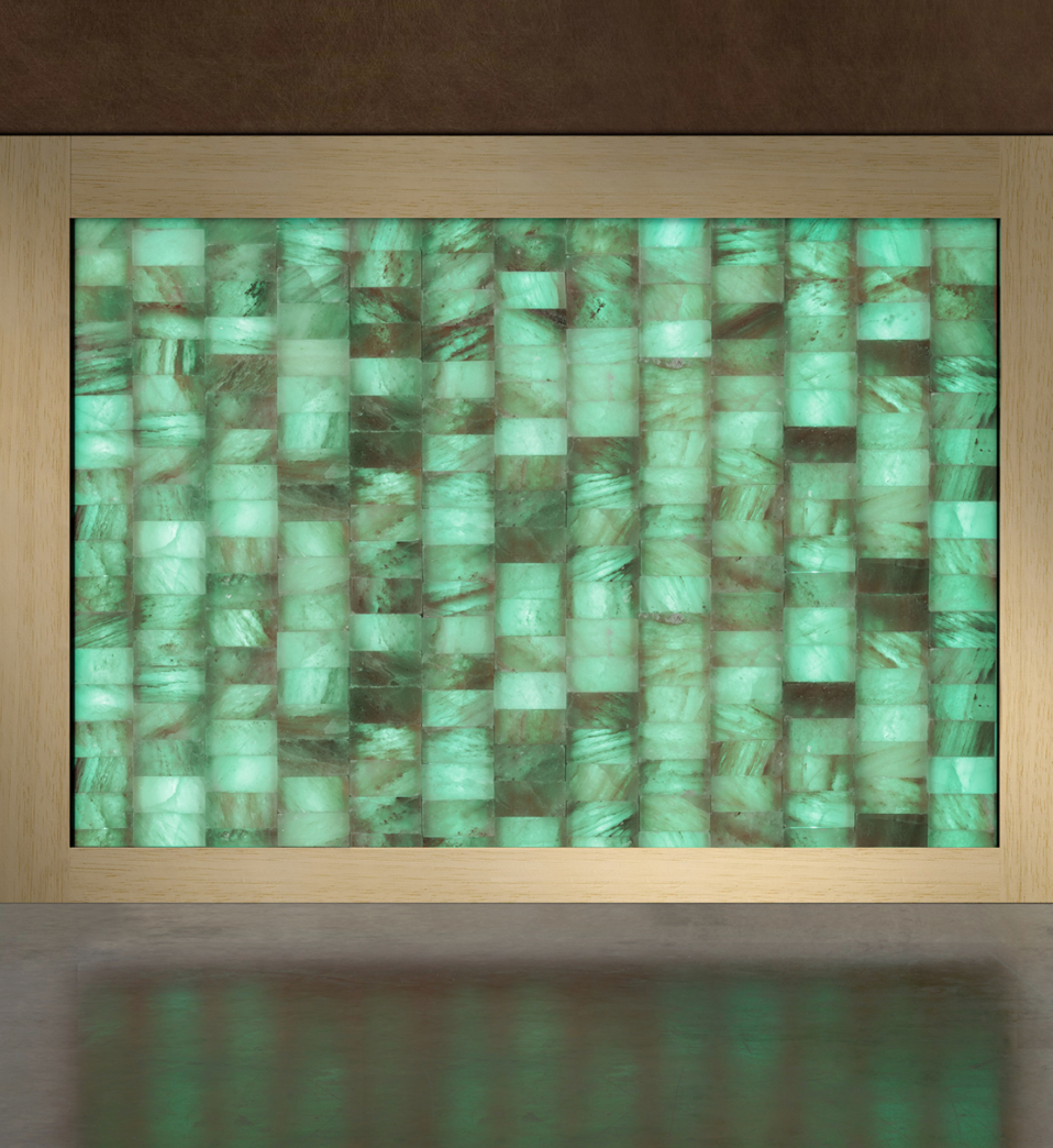 I mattoni sono di puro sale rosa dell’Himalaya con dimensione 20x10x5 cm che vengono sovrapposti in colonne affiancate fra loro e retroilluminate da strip LED RGB tutte coordinate tra loro, per avere una perfetta illuminazione uniforme e senza zone d’ombra. Superiormente viene realizzata una cornice il legno removibile, in modo da poter intervenire agevolmente in caso di eventuali manutenzioni, come ad esempio la sostituzione di un LED esausto, senza dover rompere il sale.