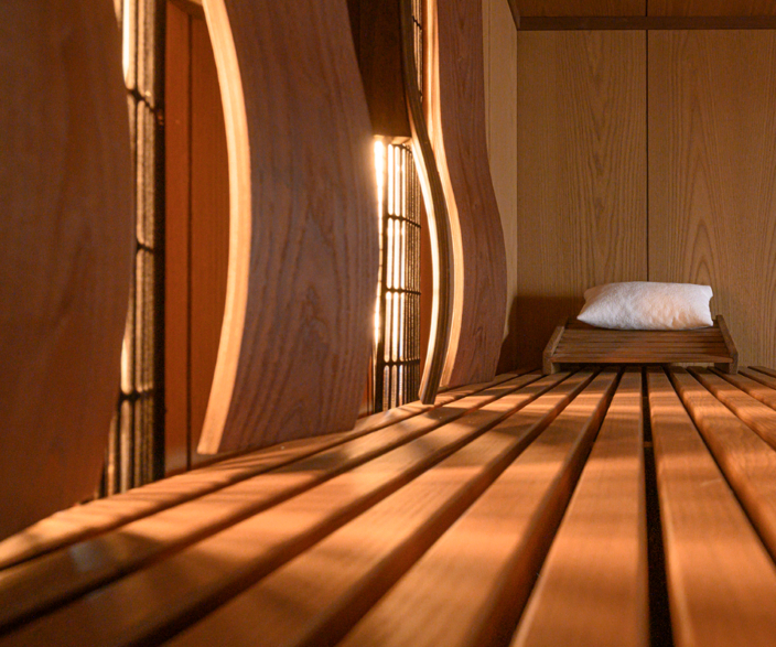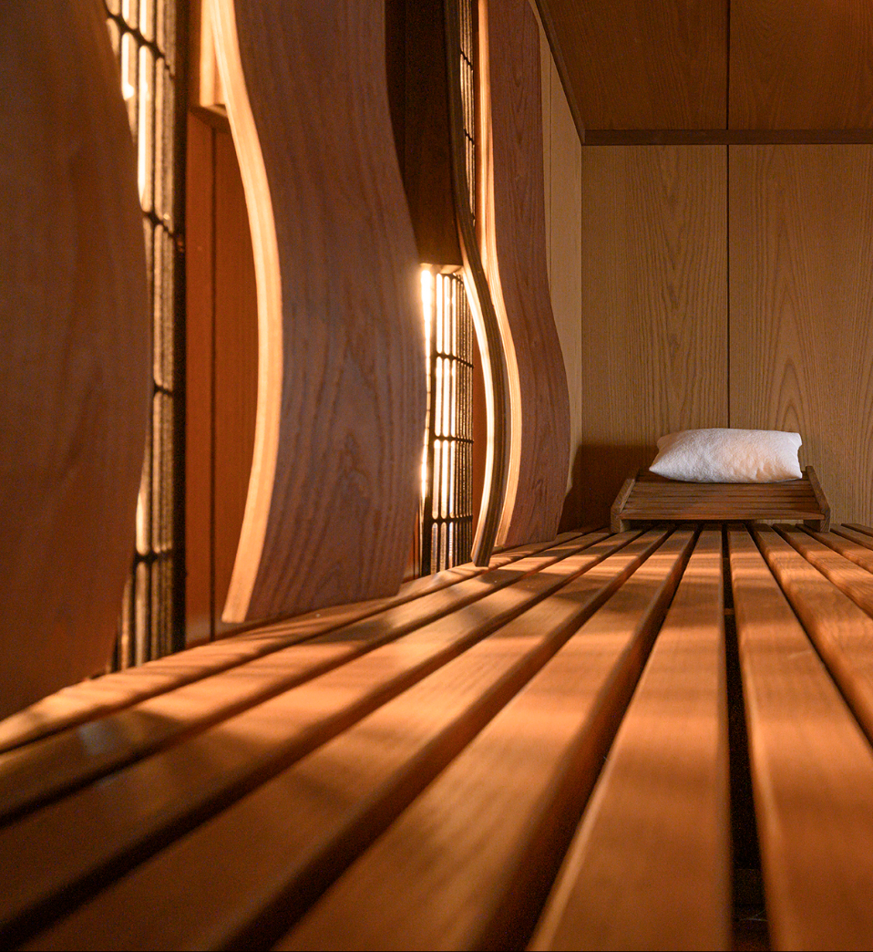 Le pareti interne sono realizzate in legno Hemlock canadese, scelto per la sua stabilità dimensionale e resistenza al calore, mentre la panca sospesa e lo schienale sono in legno Abachi, un’essenza chiara e a bassa conducibilità termica, ideale per il contatto diretto con la pelle.