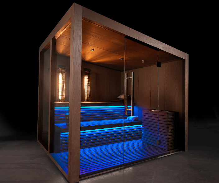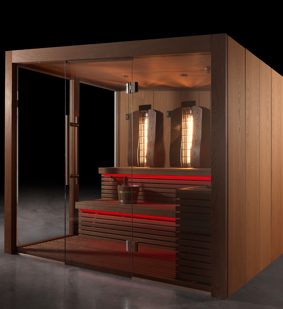 La cabina è realizzata con pareti interne in Hemlock, panca sospesa in Abachi e facciata frontale in vetro temperato da 10 mm, combinando estetica raffinata e funzionalità professionale.