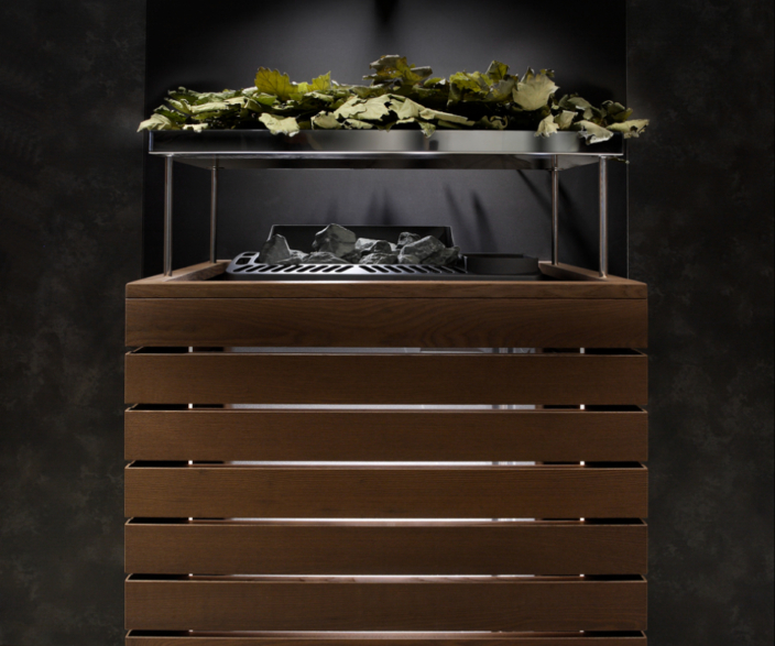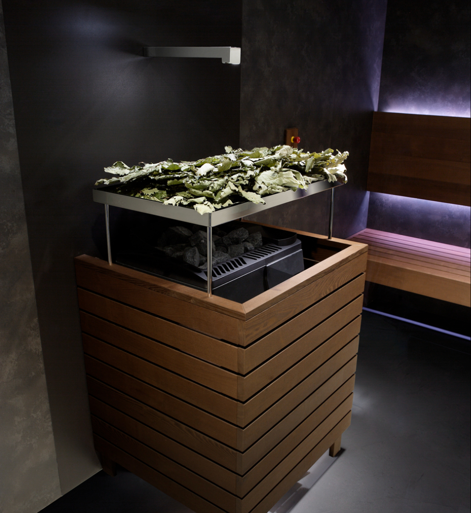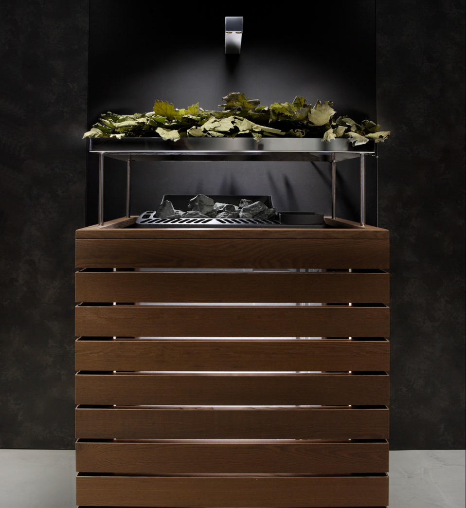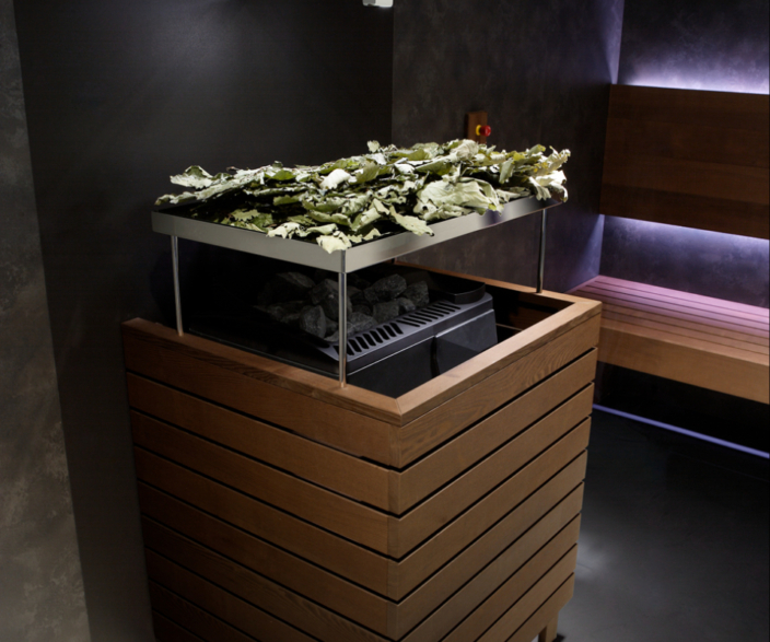 Sopra la stufa è posizionato un vassoio per infusione di erbe, da cui si sprigionano i profumi durante la seduta, creando un’atmosfera naturale e avvolgente.